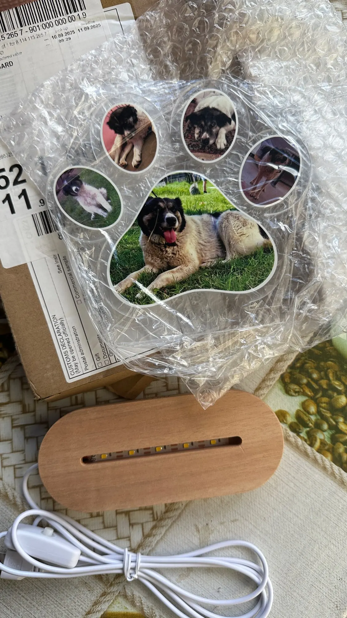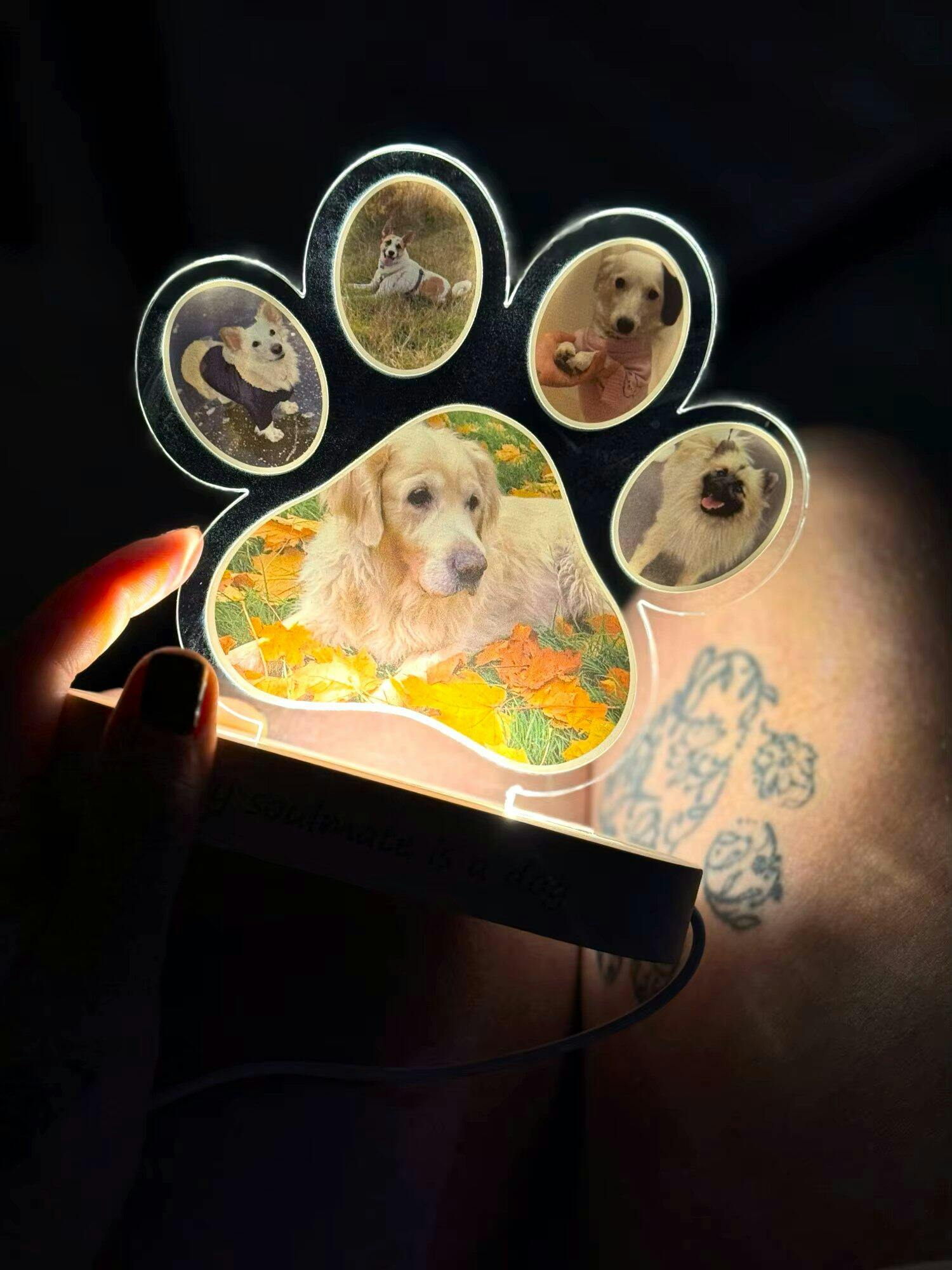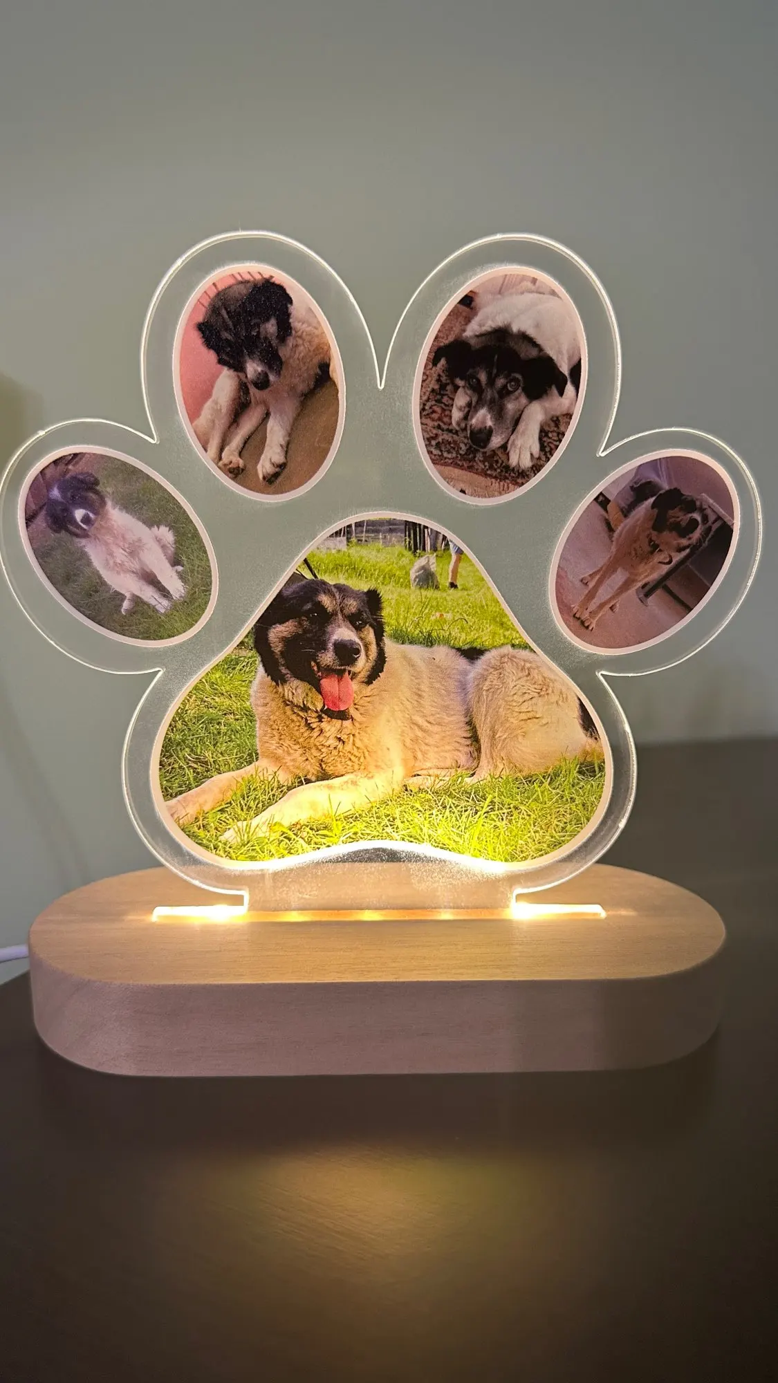 A paw-shaped night light designed to hold photos in each pad, creating a gentle glow that highlights special memories with your pet. It’s a unique way to showcase playful moments, cuddly snapshots, or to keep the memory of a beloved companion close.